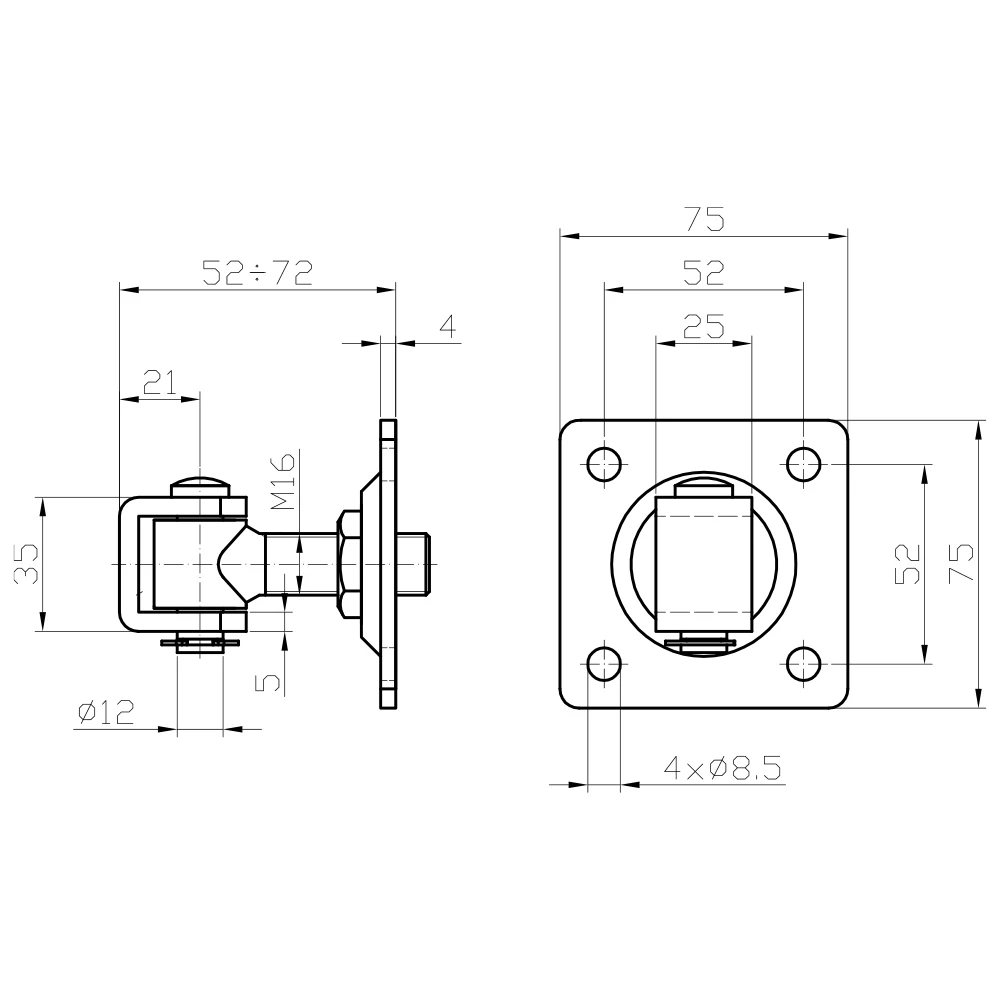 Montážní deska o rozměrech 75×75 mm se čtyřmi upevňovacími otvory zajišťuje stabilní a rovnoměrný přenos zatížení na sloupek. Rozsah regulace 52–72 mm umožňuje flexibilní přizpůsobení vysunutí závěsu různým tloušťkám profilů a sloupků, což výrazně usnadňuje práci montážním týmům na stavbě.