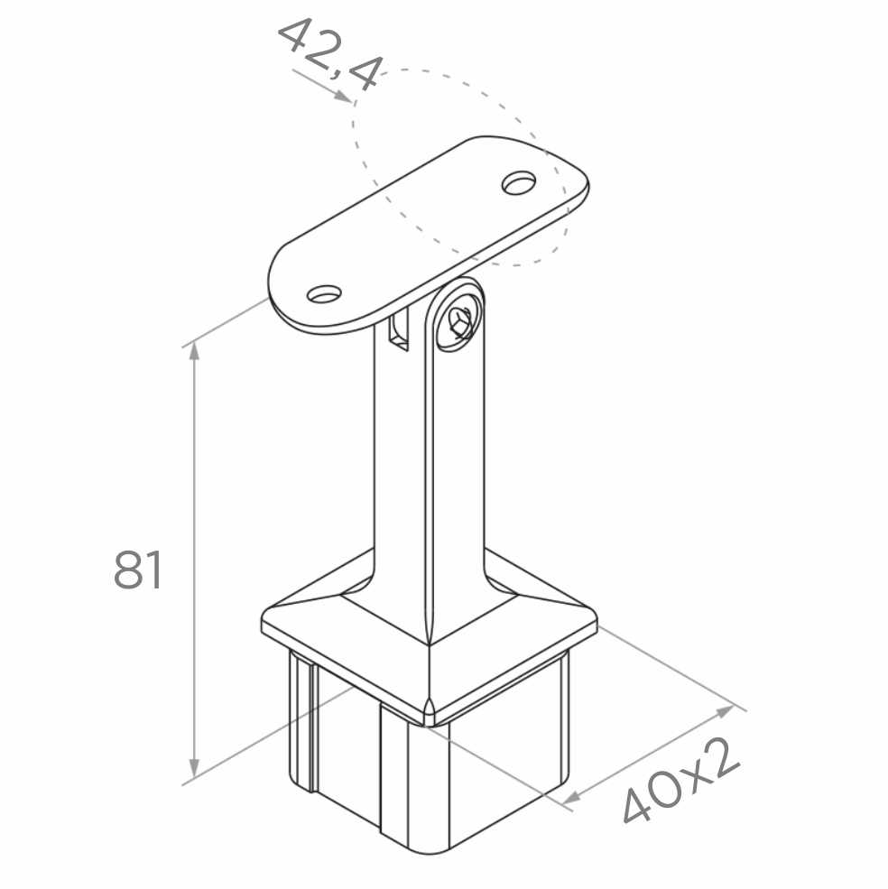Podpora je určena pro použití v systémech nerezových zábradlí založených na čtvercových sloupcích 40×40 mm. Kloubová konstrukce umožňuje plynulou regulaci úhlu sklonu madla, což výrazně urychluje montáž na schodišťových stupních a svazích. Prvek se montuje k madlu metodou lepení, což zajišťuje čisté, bezšroubové dokončení viditelných povrchů. Nerezová ocel AISI 304 je určena pro vnitřní použití — v případě venkovního montáže se doporučuje použití oceli AISI 316.