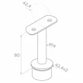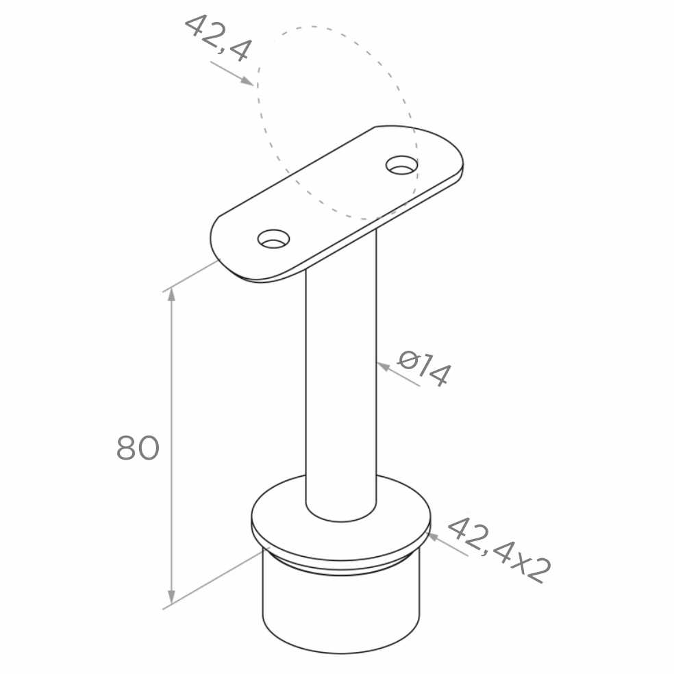 Podpora je pevný prvek — bez možnosti úpravy úhlu, což zajišťuje tuhost a opakovatelnost geometrie na celé délce zábradlí. Dolní pouzdro je přesně přizpůsobeno sloupkové trubce 42,4×2 mm a horní upevňovací deska je profilována pro zábradlí o průměru 42,4 mm. Dva montážní otvory v desce umožňují dodatečné zajištění šrouby, pokud to projekt vyžaduje.