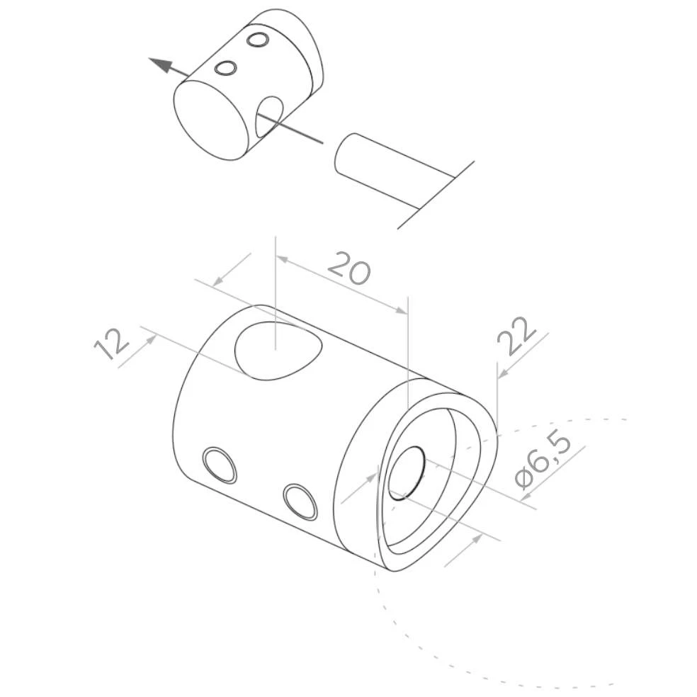Držák se montuje na sloupek zábradlí a slouží k vedení tyče o průměru 12 mm skrz jeho vnitřek. Díky průchozí konstrukci tyč prochází naskvoz, což umožňuje budování souvislých, rovnoběžných linií výplně na celé délce pole. Toto řešení výrazně urychluje montáž vícepolových zábradlí – stačí jedna tyč na několik sekcí, bez nutnosti zkracování a spojování krátkých úseků.