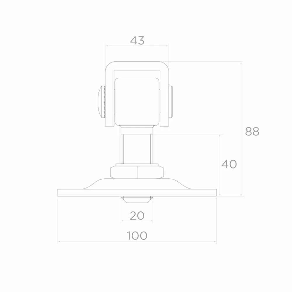 Pant je určen k montáži na sloupky křídlových bran — ocelových, zděných nebo betonových. Čtyři montážní otvory v desce (Ø 10,5 mm) umožňují spolehlivé přišroubování k podkladu pomocí odpovídajících šroubů nebo kotev. Po upevnění desky na sloupek a oka na křídlo brány stačí dotáhnout regulační matici na závitu M20 pro nastavení požadované polohy křídla. Regulaci lze opakovat mnohokrát — je to obzvláště užitečné v zimě, kdy se kov smršťuje vlivem nízkých teplot, a v létě, kdy se termicky rozpíná.