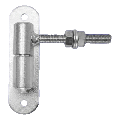 Ocelový regulovatelný válcovaný pant s koulí a montážním štítkem – spolehlivé řešení pro zavěšení plotových branek. Závit M12 s nastavovací maticí umožňuje přesné nastavení svislé polohy branky kdykoli – jak hned po montáži, tak během provozu, když konstrukce poklesne nebo se změní teplotní podmínky.