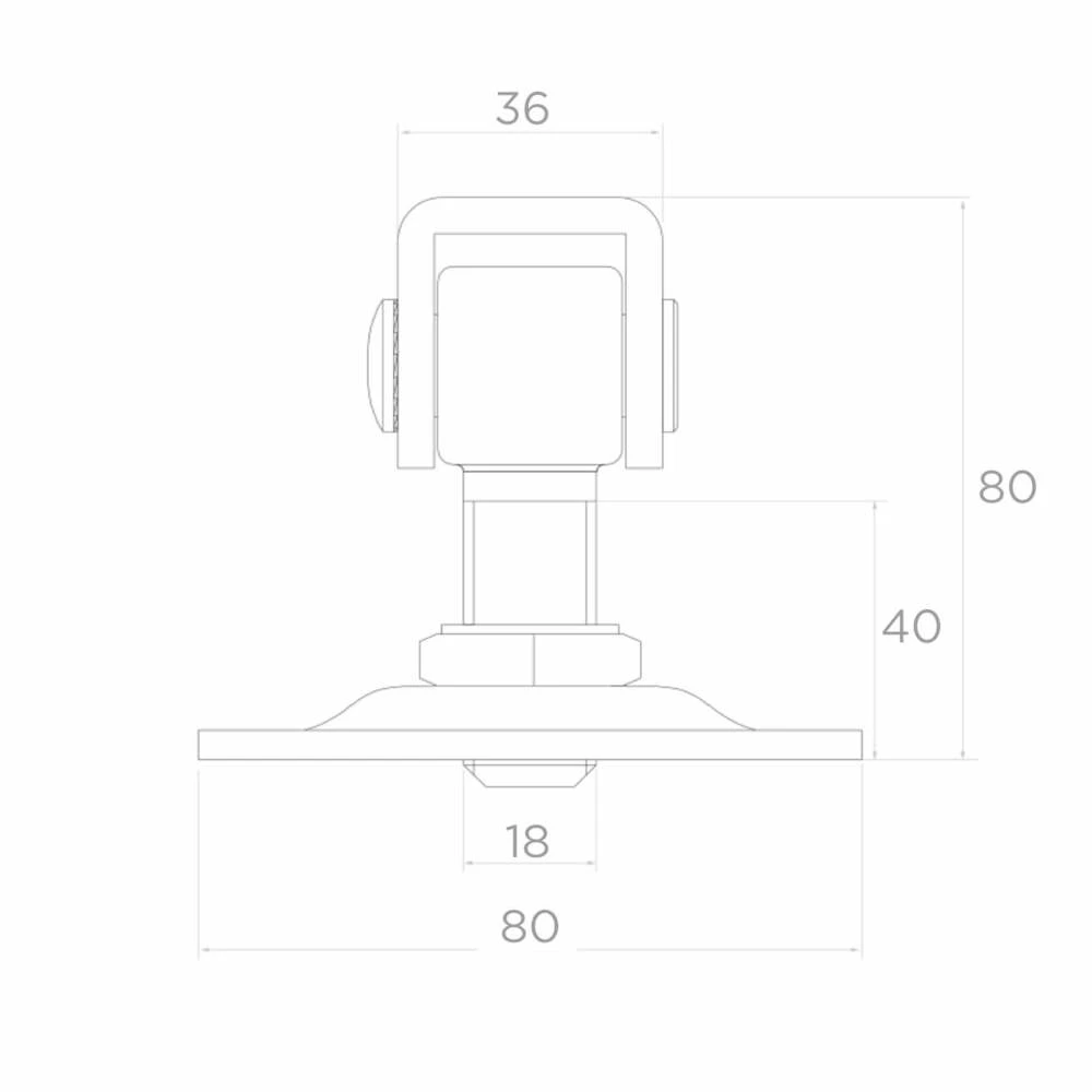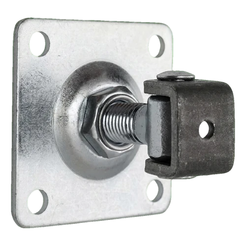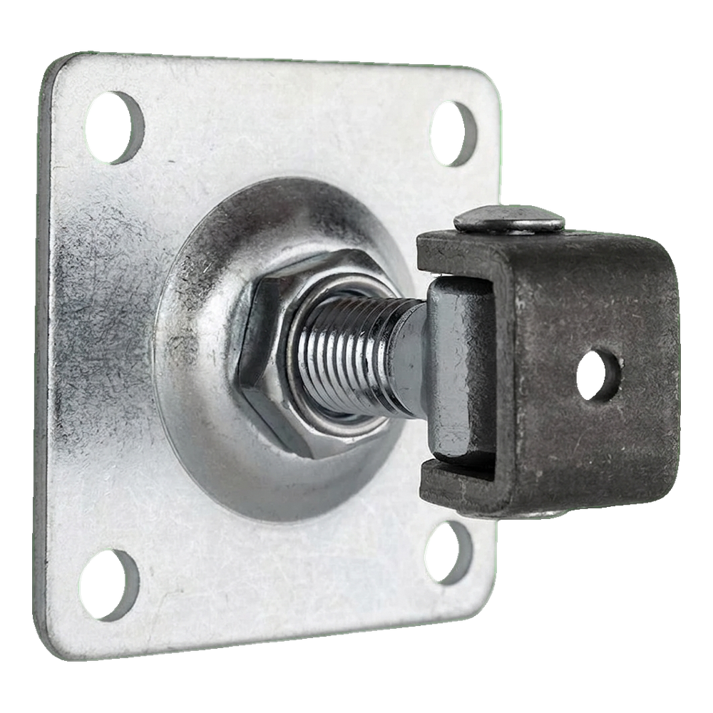 Ocelový regulovatelný pant PSG se šroubem M18 určený k montáži křídlových bran a branek. Štítek o rozměrech 80×80 mm se čtyřmi montážními otvory zajišťuje stabilní a spolehlivé uchycení ke sloupku. Díky závitové regulaci lze pant přesně vyrovnat křídlo brány kdykoli — jak při montáži, tak i po letech provozu, když se konstrukce prověsí nebo tepelně deformuje.