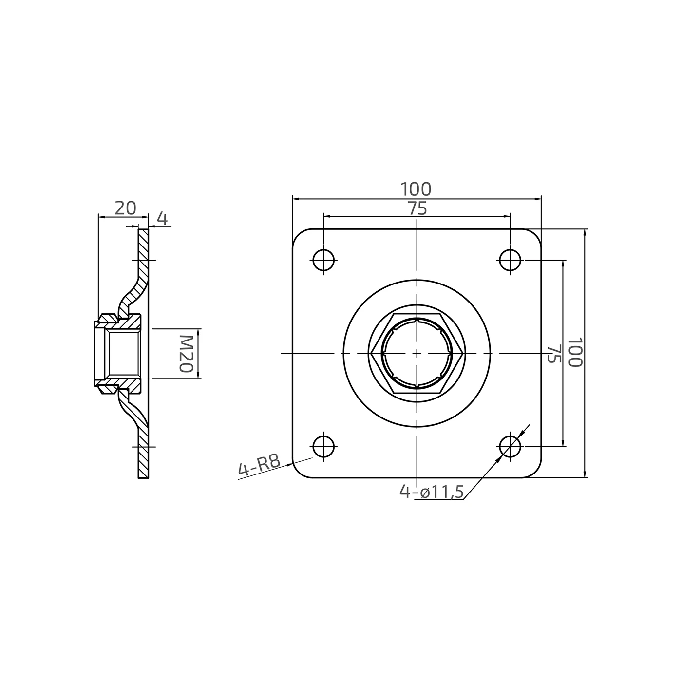 PSG štítek pod závěs nastavitelný M20 – nerezová ocel AISI 304, 100×100 mm