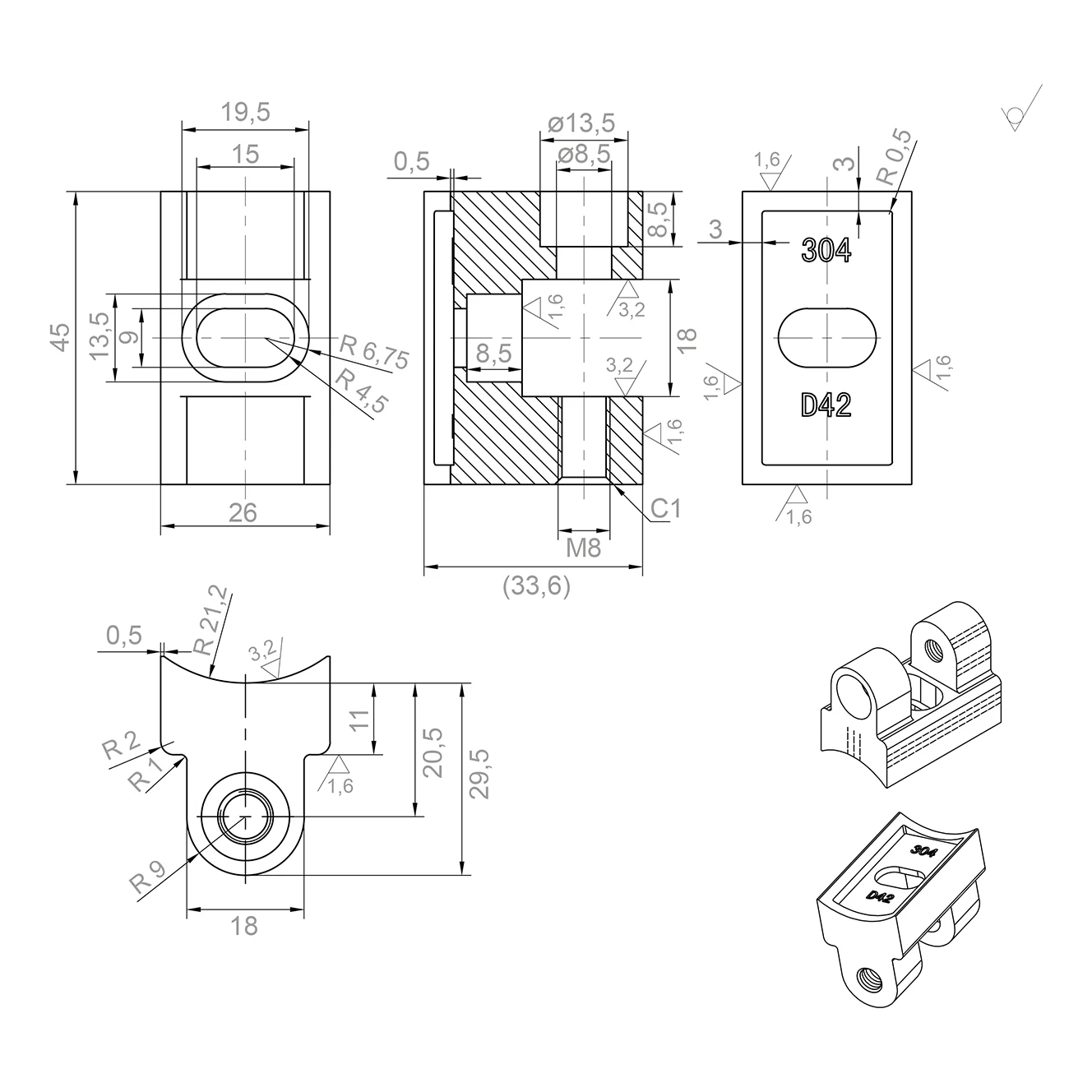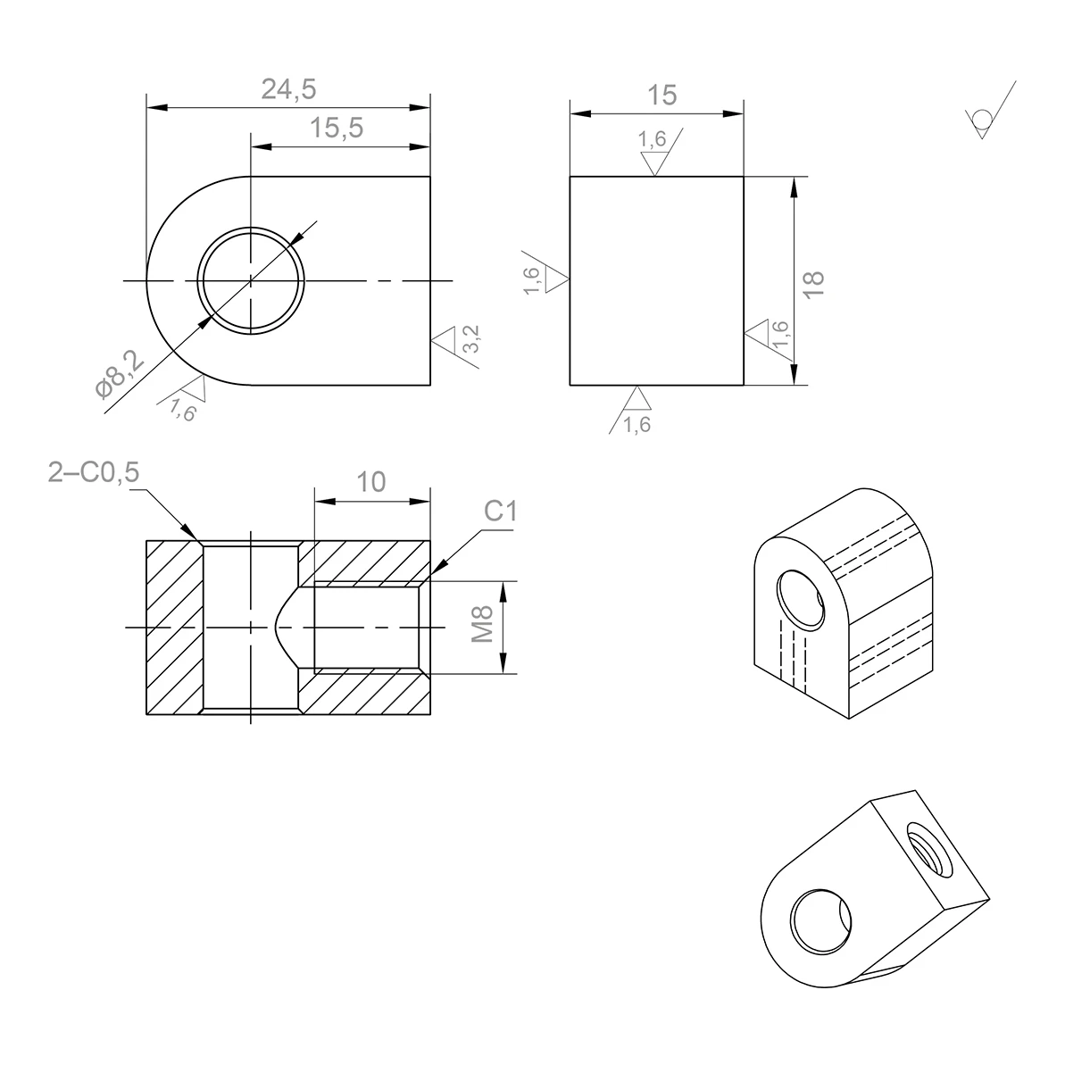 - Zkosení: 2×C0,5 na oku, C1 na závitových otvorech
