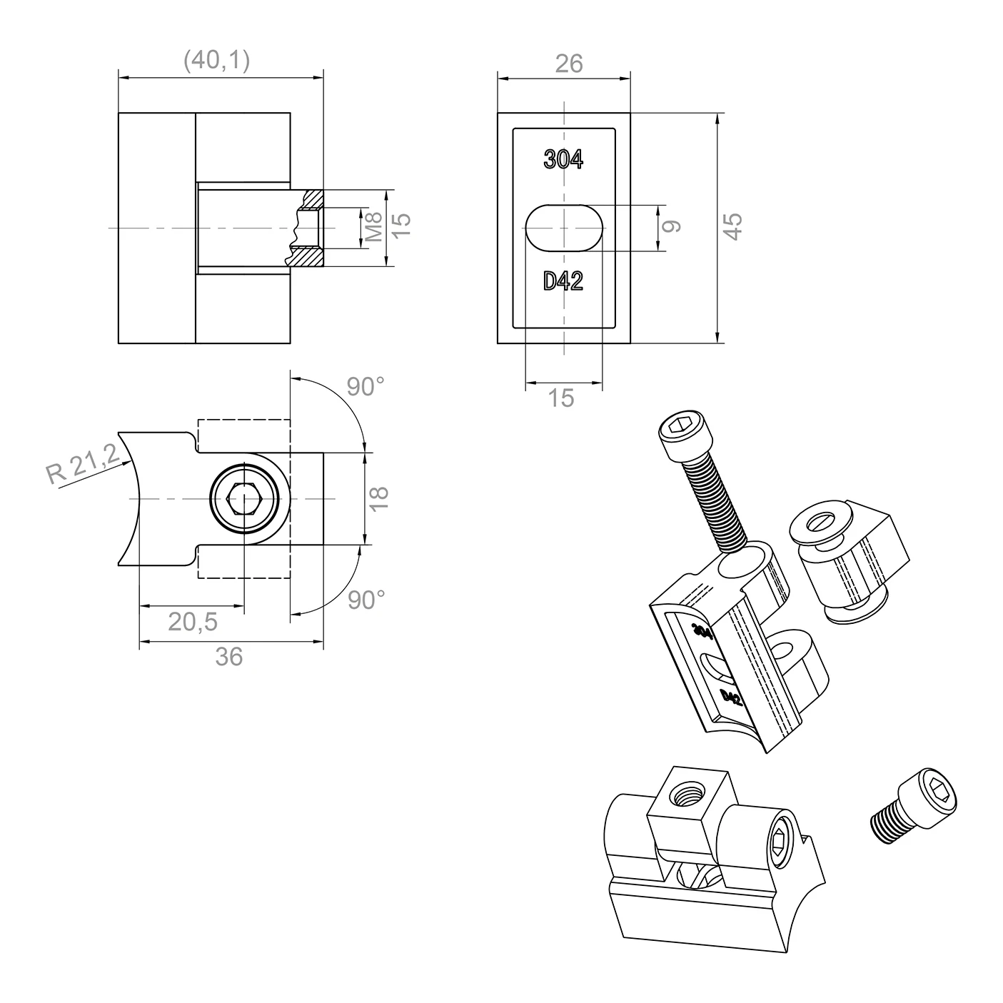 Pant 180° pro držák na sklo z nerezové oceli AISI 304 v saténovém provedení — precizní spojovací prvek určený pro systémy skleněných balustráد montovaných na trubky o průměru 42,4 mm. Díky plnému rozsahu otáčení 180° (2 × 90°) umožňuje plynulou regulaci úhlu nastavení skleněných panelů, což výrazně usnadňuje montáž na netypických tvarech konstrukce.