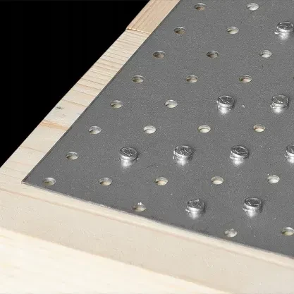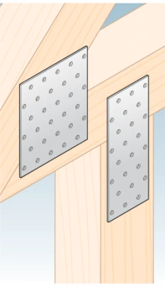 Perforovaná destička nachází široké uplatnění v dřevostavbách — od jednoduchých zpevnění až po složité spoje střešních vazníků. Montáž se provádí pomocí následujících spojovacích prvků: