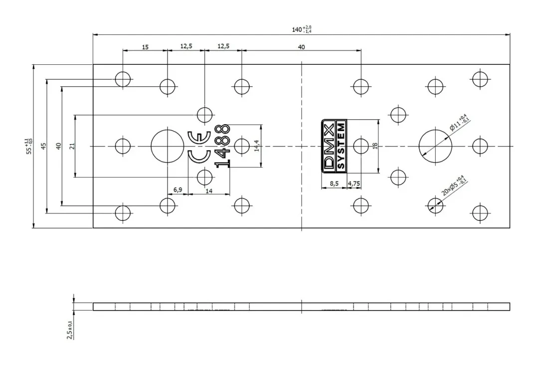 - Montážní otvory: 20 otvorů ø5 mm + 2 otvory ø11 mm