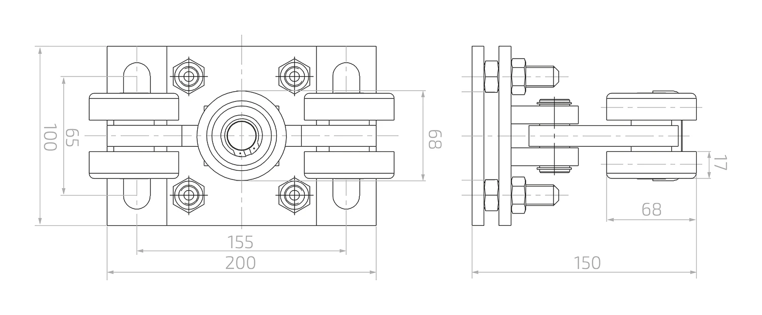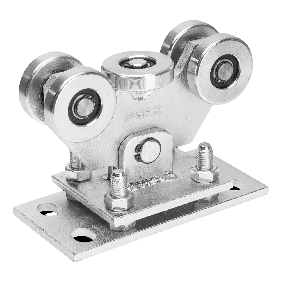 Vozík je vybaven 5 ocelovými kladkami — čtyři nosné kladky uspořádané svisle a jedna vodorovná kladka plnící funkci vodící. Toto uspořádání zajišťuje stabilní podepření kolejnice brány jak zdola, tak z boku, což se projevuje tichým chodem a minimálním opotřebením pojezdových prvků. Těleso vozíku je spojeno s montážní deskou pomocí kyvného čepu, díky čemuž se celá soustava kladek může vychylovat a kompenzovat případné montážní odchylky. Výšková regulace se provádí šrouby zajištěnými maticemi — umožňuje přesné nastavení výšky kolejnice vůči sloupkům brány bez nutnosti použití distančních podložek.