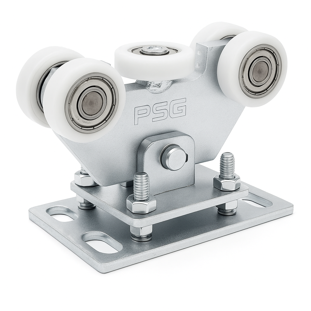 Pojezdný vozík 70 je odolný, 5-kladkový pojezdný prvek určený pro samonosné posuvné brány. Kyvná konstrukce s čepem umožňuje automatické přizpůsobení se vodící liště, čímž eliminuje napětí a zajišťuje plynulý chod brány i při vysokém zatížení – ideální řešení pro montážníky hledající spolehlivé komponenty pro brankové systémy.