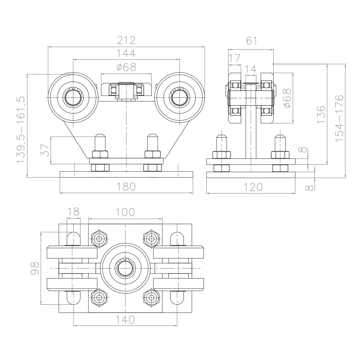 Vozík je přizpůsoben pro kolejnici o rozměrech 80×80×5 mm a montuje se pevně na základnu. Vestavěný mechanismus výškového nastavení pomocí šroubů umožňuje přesné vyrovnání brány v rozsahu 139,5–161,5 mm (čelní pohled) a 154–176 mm (boční pohled), což výrazně usnadňuje montážní práce a kompenzuje případné nerovnosti podkladu. Celý vozík je opatřen zinkovou vrstvou, která zaručuje odolnost proti korozi a dlouhodobé používání venku.