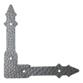 Ocelové zpevnění rohu 200×200 mm značky Postal je dekorativní kování určené pro zpevňování a ztužování rohů bran, branček a dveří. Díky ozdobné kladivkové faktuře a charakteristickým zakončením ve tvaru hrotů element spojuje konstrukční funkci s estetickou — dokonale se hodí do stylizace kovaných bran a plotů v rustikálním stylu.