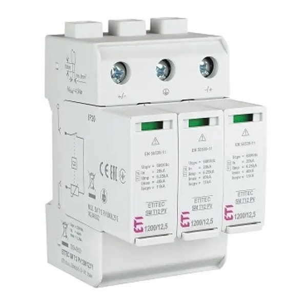 | Série a typ | Přepěťová ochrana PV DC Typ 1+2 (B+C) 1200V 3P 12,5kA 4,4kV ETITEC SM T12 PV 1200/12,5 Y 002440630 ETI |