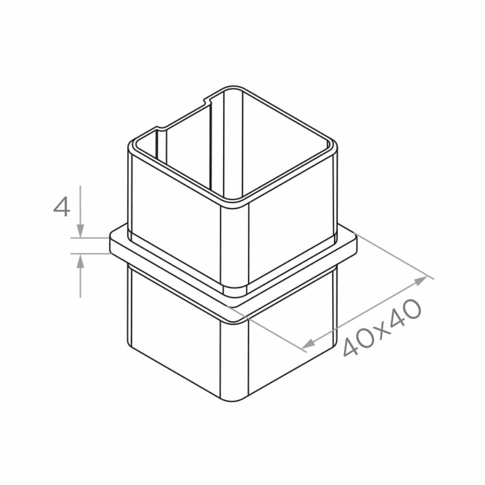 Přímý spojovací konektor k zasunutí do čtvercových profilů 40×40 mm — spolehlivý konstrukční prvek nerezových zábradlí, navržený s ohledem na estetické a trvalé spojení profilů sbíhajících se v jednom bodě. Vyroben z nerezové oceli AISI 304 s povrchovou úpravou satén, ideálně se komponuje s ostatními prvky zábradlového systému 40×40.