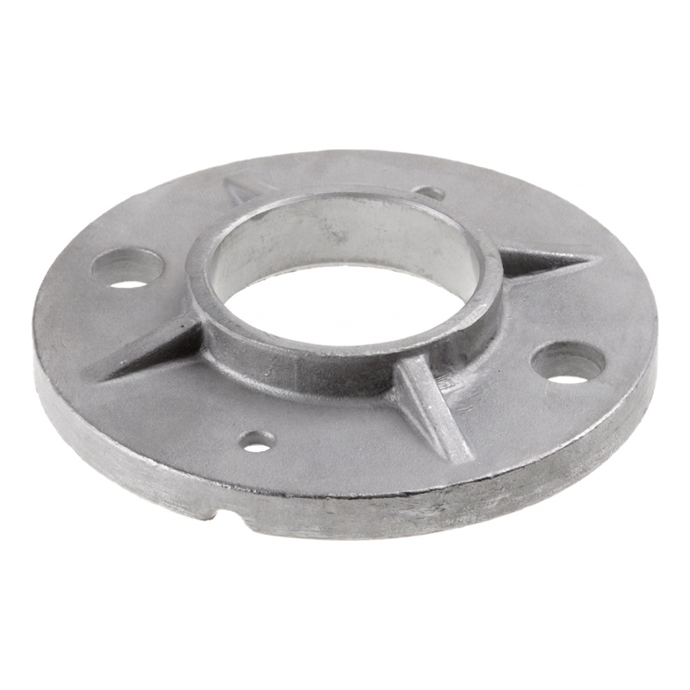 Přírubová montážní základna (křížek) určená pro upevnění sloupků zábradlí z trubky o průměru 42,4 mm. Masivní ocelový odlitek se třemi výztužnými žebry zajišťuje tuhé a trvanlivé spojení sloupku s podkladem. Tři montážní otvory umožňují spolehlivé přišroubování základny k podlaze, stropu nebo boku konstrukce — ideální řešení pro instalatéry vnitřních i venkovních zábradlí.