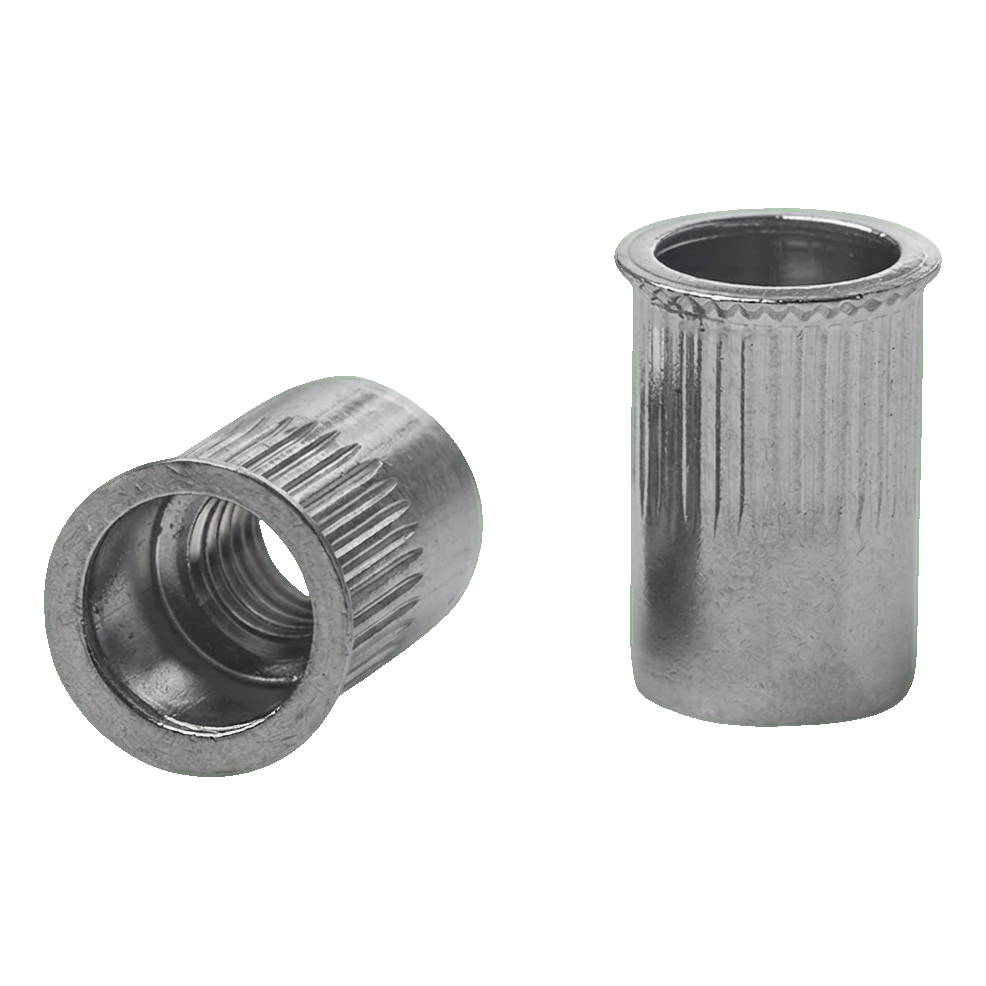 Kuželová příруба zmenšená s rýhovaným třmenem zajišťuje pevné, stabilní a těsné přilnutí k připevňovanému prvku. Rýhování účinně zabraňuje otáčení nýtovací matky v montážním otvoru, což se projevuje trvanlivostí a spolehlivostí každého spojení. Montáž je výjimečně rychlá — stačí nýtovačka na nýtovací matky, abyste během několika sekund získali hotový závit v základním materiálu.