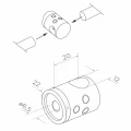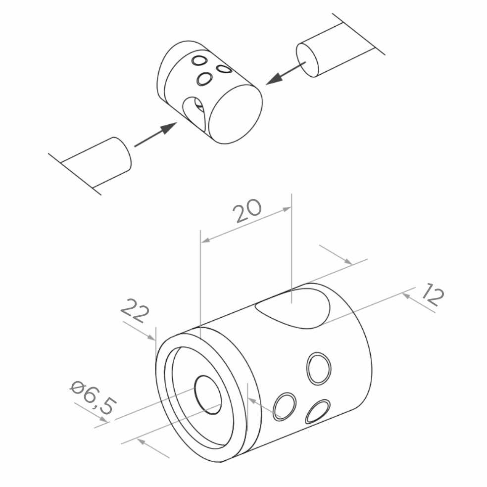 Objímka se montuje přímo na hlavní trubku zábradlí a umožňuje průchozí vedení výplňové tyče, což výrazně urychluje montáž a usnadňuje dosažení rovnoměrných, opakovatelných rozestupů mezi tyčemi. Vestavěné dotahovací šrouby zajišťují spolehlivé a trvalé upevnění tyče uvnitř objímky.