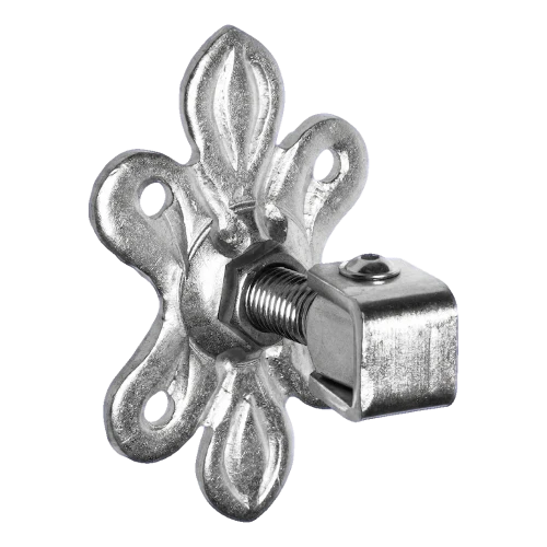 Ozdobný štítek ve tvaru heraldické lilie dodává závěsu estetický, dekorativní charakter — ideální pro brány a vrátka, kde záleží nejen na trvanlivosti, ale také na vzhledu kování. Čtyři montážní otvory ve štítku zajišťují stabilní a rovnoměrné rozložení zatížení na povrchu sloupku nebo křídla.
