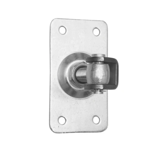 Regulace po montáži je klíčovou výhodou tohoto závěsu. V případě prověšení křídla brány, sezónních tepelných deformací nebo po letech provozu — stačí korigovat polohu regulační maticí, bez nutnosti demontáže celé konstrukce. Obdélníkový štítek se čtyřmi montážními otvory zajišťuje stabilní a rovnoměrné přenášení zatížení na sloupek. Přípustné zatížení páru závěsů namontovaných na křídle o délce 2 m činí 105 kg, což činí produkt vhodným pro typická křídlová vrata a branky v pozemkových plotech.