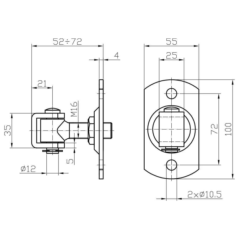 Ocelový regulovatelný závěs M16 s obdélníkovým montážním štítkem je spolehlivé řešení pro profesionální zavěšení branek a křídlových bran. Díky regulaci hloubky v rozsahu 52–72 mm umožňuje přesnou korekci pozice křídla jak při prvotní montáži, tak během pozdější exploatace — bez nutnosti demontáže konstrukce.