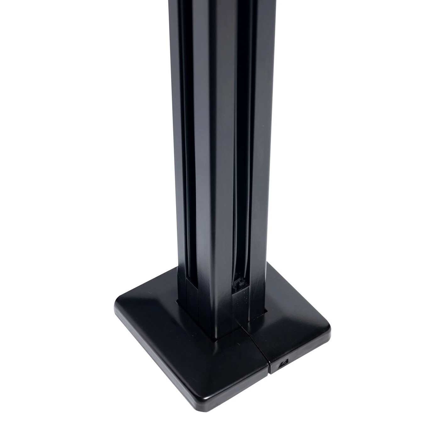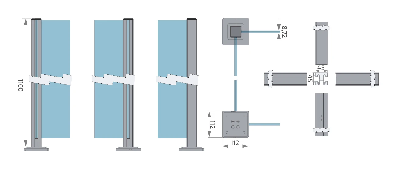 Profil s průřezem 45×45 mm a výškou 1100 mm je určen pro laminované sklo o tloušťce 8,72 mm. Montážní systém do podlahy s plochou základnou 112×112 mm zaručuje stabilitu konstrukce a umožňuje rychlé kotvení do betonu nebo jiného nosného podkladu. Elegantní černá matná úprava získaná metodou práškového lakování zajišťuje odolnost vůči povětrnostním podmínkám a dodává zábradlím moderní, minimalistický charakter.