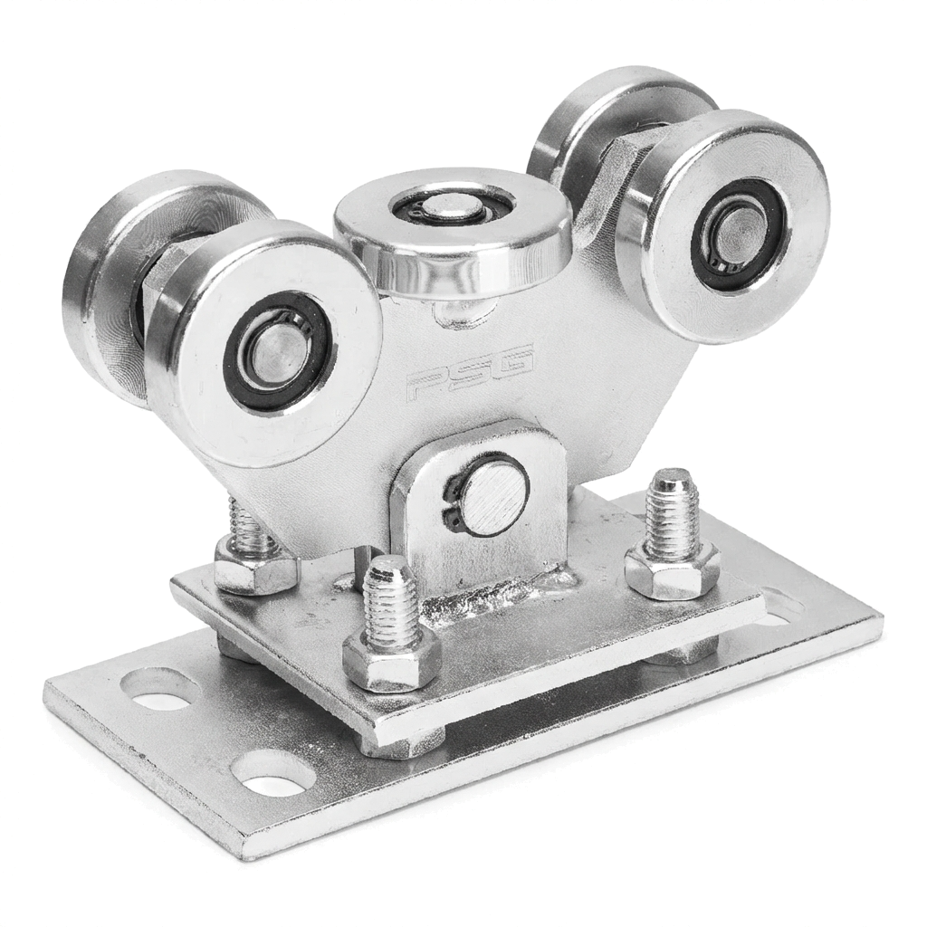 Vozík je vybaven 5 kovovými kolečky, z nichž jedno je horizontální a stabilizuje vedení brány. Kyvná konstrukce – vozík je spojen se základnou pomocí čepu, díky čemuž se automaticky přizpůsobuje kolejnici posuvné brány. Výškové nastavení se provádí šrouby, což umožňuje přesné vyrovnání brány při montáži.