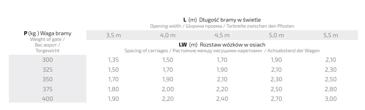 Správná rozteč vozíků v osách závisí na hmotnosti brány a délce brány ve světlosti. Následující tabulka usnadňuje výběr: