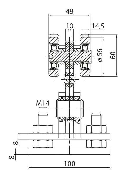 Rozměrový výkres zobrazuje průřez pojezdového vozíku s vyznačenými klíčovými rozměry. Dvouúrovňové uspořádání kladek zajišťuje optimální rozložení sil a dvojitá deska základny s regulací šrouby M14 umožňuje přesné nastavení výšky a svislosti křídla brány po montáži.