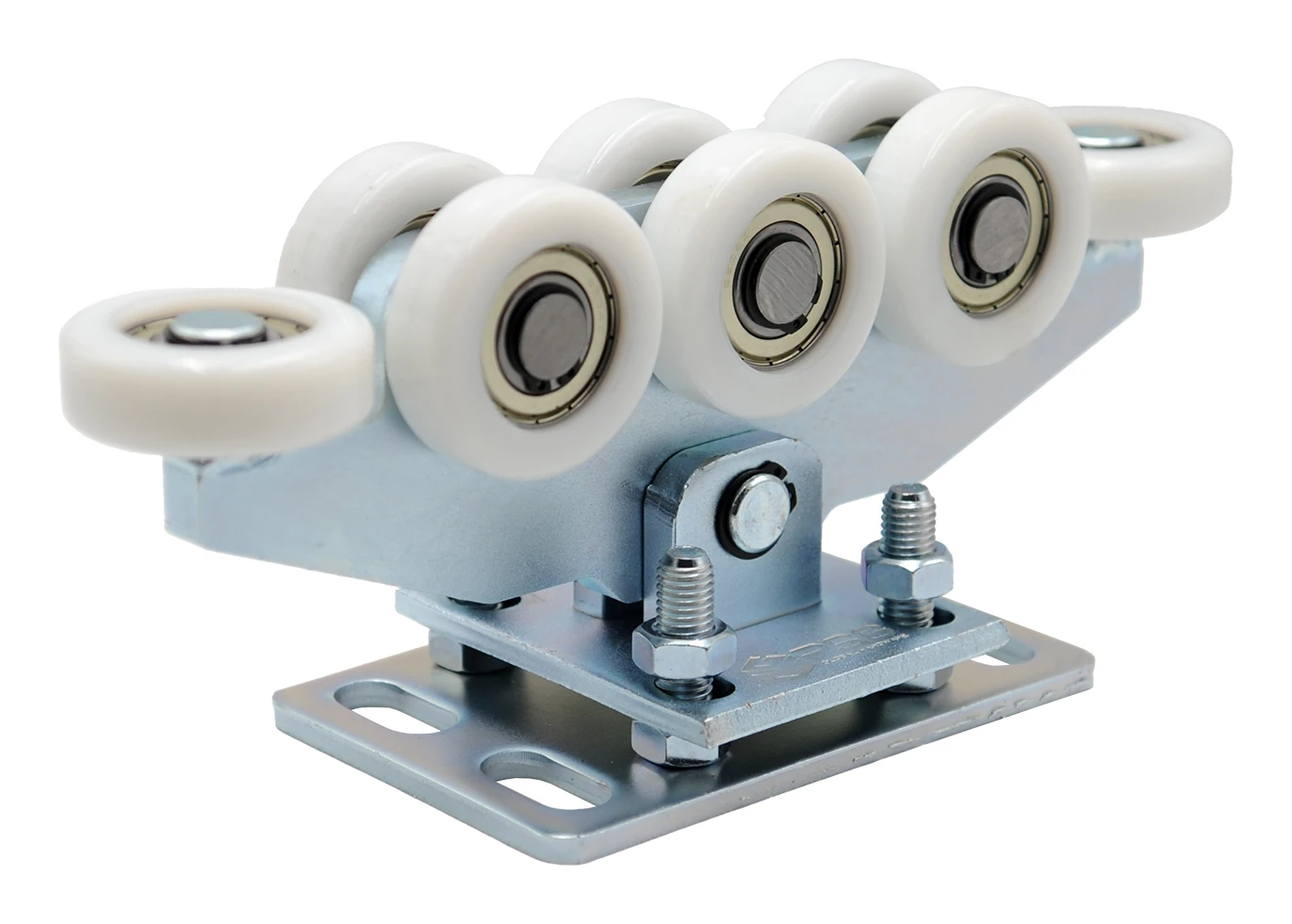 Každý vozík je vybaven čepem spojujícím tělo s montážní základnou, díky čemuž se mechanismus volně přizpůsobuje dráze pohybu brány. Kyvné zavěšení snižuje napětí vznikající při provozu — zejména při vysokém zatížení a intenzivním používání. Toto řešení výrazně prodlužuje životnost vozíků, kladek i vodící kolejnice. Nylonové kladky zajišťují tichý a plynulý chod, přičemž dvě dodatečné vodorovné kladky garantují boční stabilitu konstrukce a eliminují vůle a vibrace i při rychlém posunu brány.