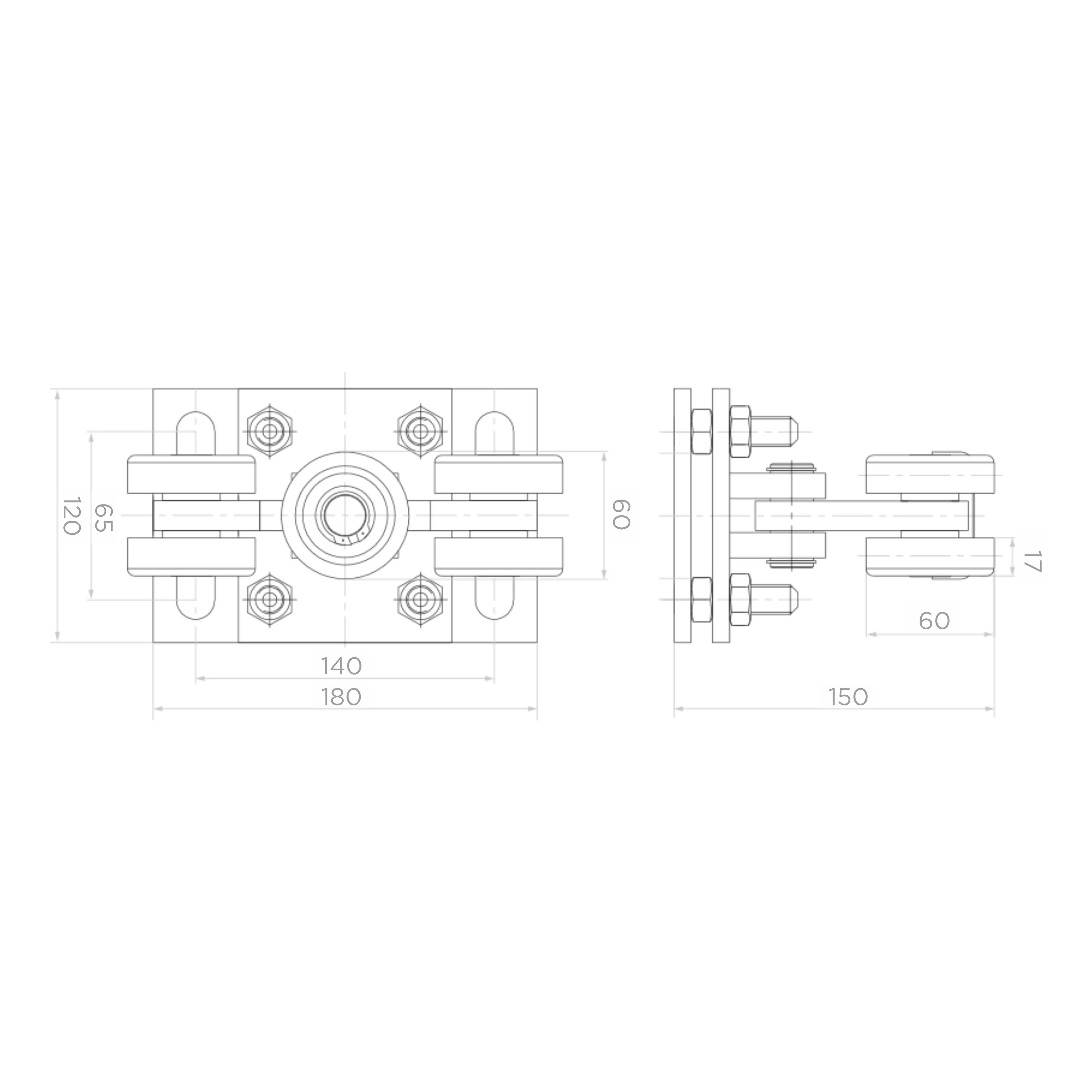 - Pojezdový vozík – 2 ks – kyvný vozík s 5 kovovými kolečky (z toho jedno vodorovné), s výškovou regulací pomocí šroubů, určený pro kolejnici 70×70×4 mm