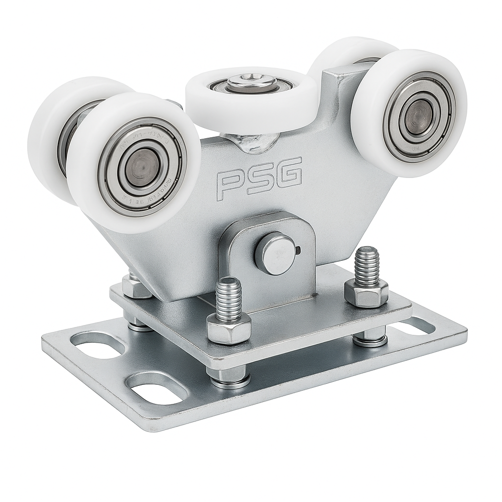 Pojezdový vozík je vybaven 5 plastovými válečky, z nichž jeden je vodorovný, které zajišťují plynulý a tichý chod brány. Kyvná konstrukce — vozík je spojen se základnou pomocí čepu, díky čemuž se automaticky přizpůsobuje profilu kolejnice. Výškové nastavení pomocí šroubů umožňuje přesné vyrovnání brány. Vozík je určen pro kolejnici 70×70×4 mm. Celá konstrukce je vyrobena z pozinkované oceli, což zaručuje odolnost proti korozi a dlouhodobé venkovní použití.