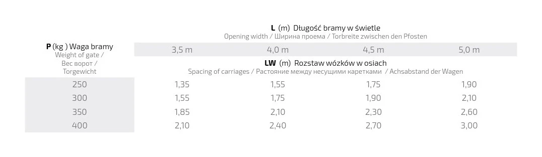 Správná rozteč pojezdových vozíků v osách (LW) závisí na hmotnosti brány (P) a světlé délce otvoru brány (L). Následující tabulka uvádí doporučené hodnoty: