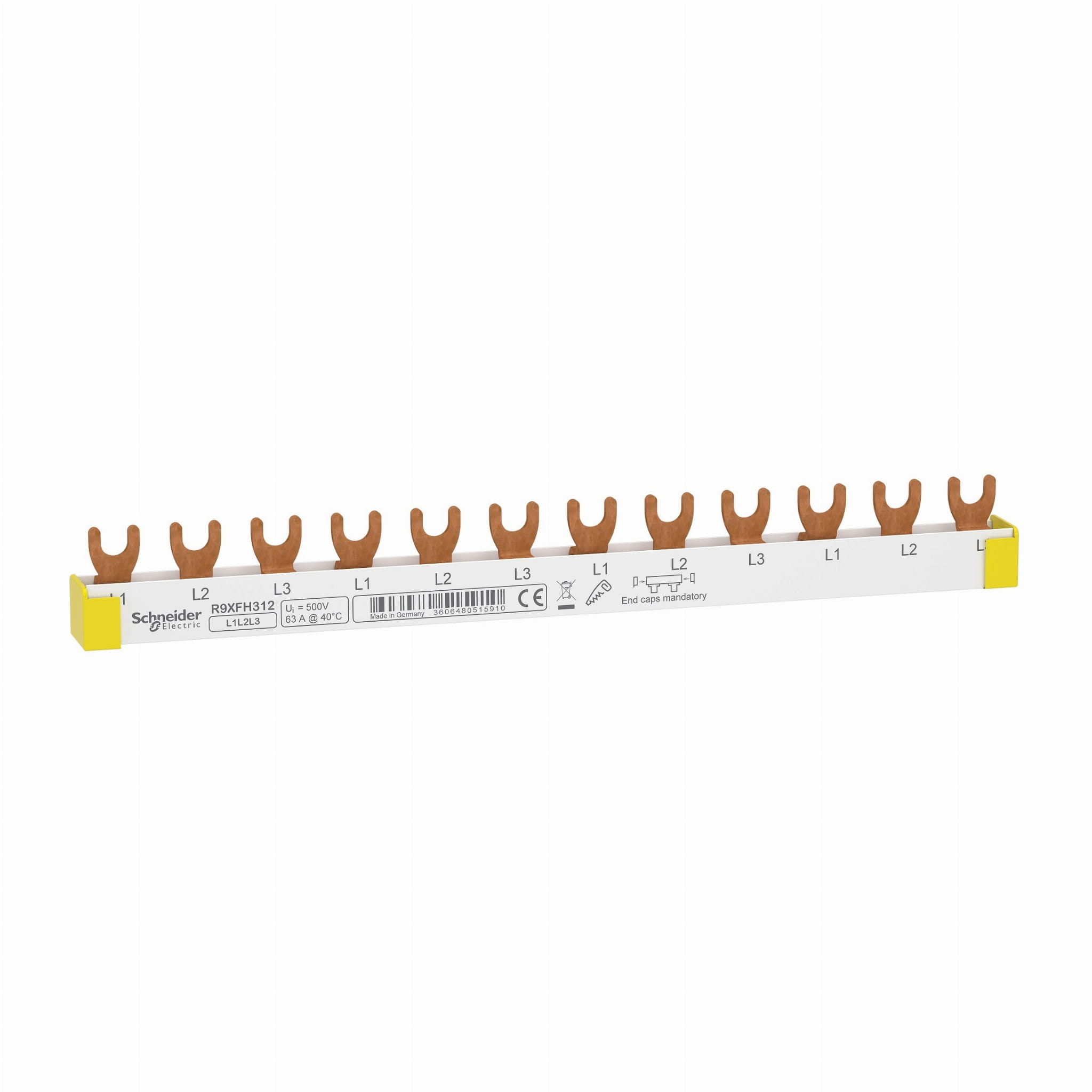 Vidlicová spojovací lišta 12 modulů 3pólové 63A R9XFH312 SCHNEIDER ELECTRIC vidlicová konektorová sběrnice je určena k přemostění, napájení a propojení výrobků. Typ sběrnice by měl být zvolen podle typu zařízení s ohledem na různé rozteče fyzikálních parametrů.