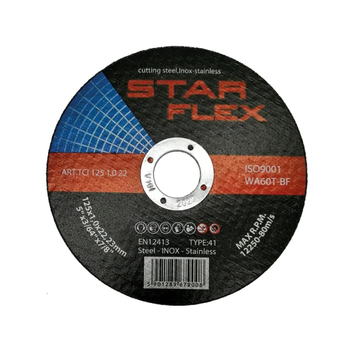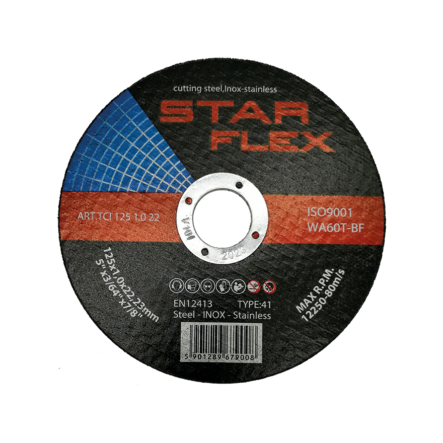 Řezný kotouč Star Flex 125×1,0 mm je tenký, plochý brusný kotouč typu 41, navržený pro přesné řezání černé oceli, nerezové (INOX) a kyselinovzdorné. Díky tloušťce pouhých 1,0 mm zajišťuje rychlé, bezotřepové řezání s minimální ztrátou materiálu — ideální řešení pro instalační týmy pracující s ocelovými profily, trubkami a kovovými konstrukcemi na stavbě.