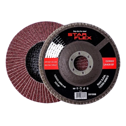 Plochý lamelový kotouč Starflex T27 o průměru 125 mm a zrnitosti 40 je vysokohodnotný brusný nástroj s korundovým pokrytím, navržený pro profesionální zpracování oceli. Díky tvrdému pojivu třídy R a odolnému podkladu ze skelného vlákna zajišťuje vynikající kontrolu práce, účinné odstraňování materiálu a rovnoměrný brousící efekt na celém povrchu — bez nutnosti použití velkého přítlaku.