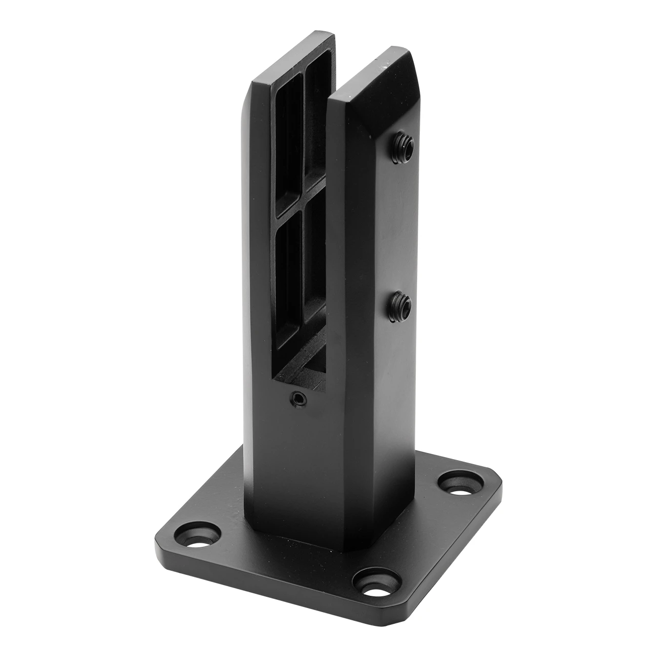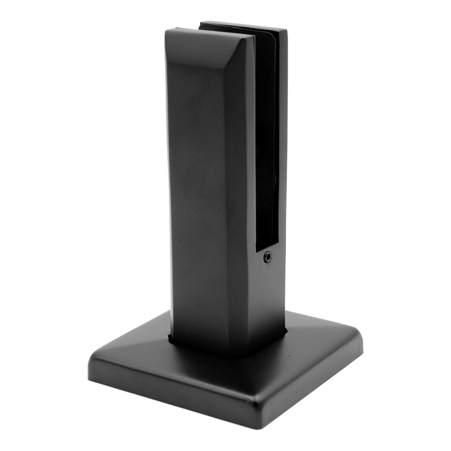 Svislý držák pro sklo typu spigot v barvě černá mat — solidní a estetický základ pro skleněná zábradlí, terасové příčky a oplocení. Vyroben z nerezové oceli AISI 304 a opatřen černým práškovým nátěrem, zajišťuje trvalou protikorozní ochranu jak uvnitř budovy, tak i venku.