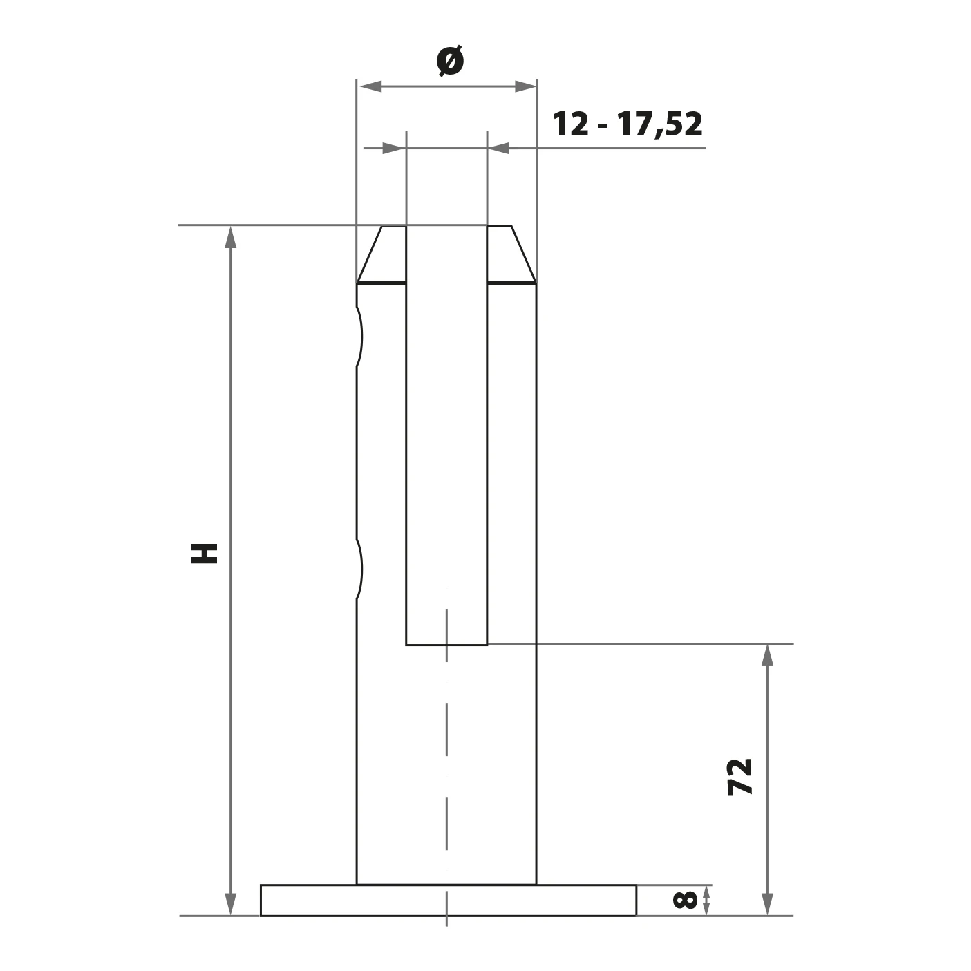 - Hloubka osazení skla: 72 mm (od spodní hrany základny ke dnu drážky)