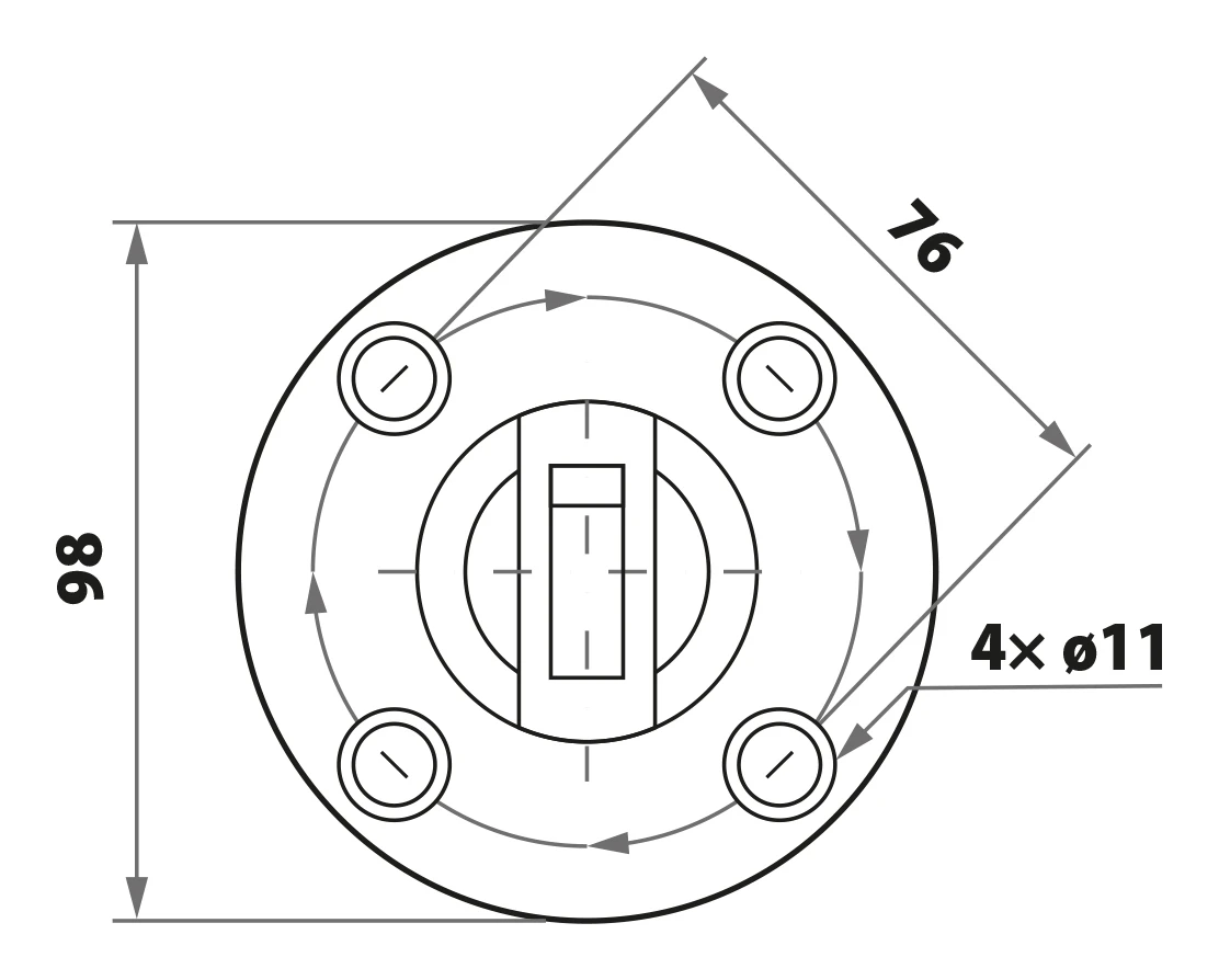 Kulatá montážní základna má 4 montážní otvory o průměru ø11 mm rozmístěné na kružnici s roztečí 76 mm, což umožňuje pevné a symetrické přišroubování k podkladu. Krycí kroužek dodaný v sadě zakrývá hlavy šroubů a zajišťuje elegantní, dokončený vzhled.