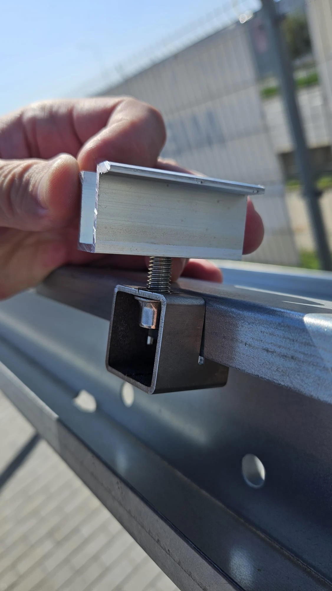Následující fotografie představují držák ZU-1 osazený na ocelové krokvi se fotovoltaickou svorkou — hotový bod upevnění panelu: