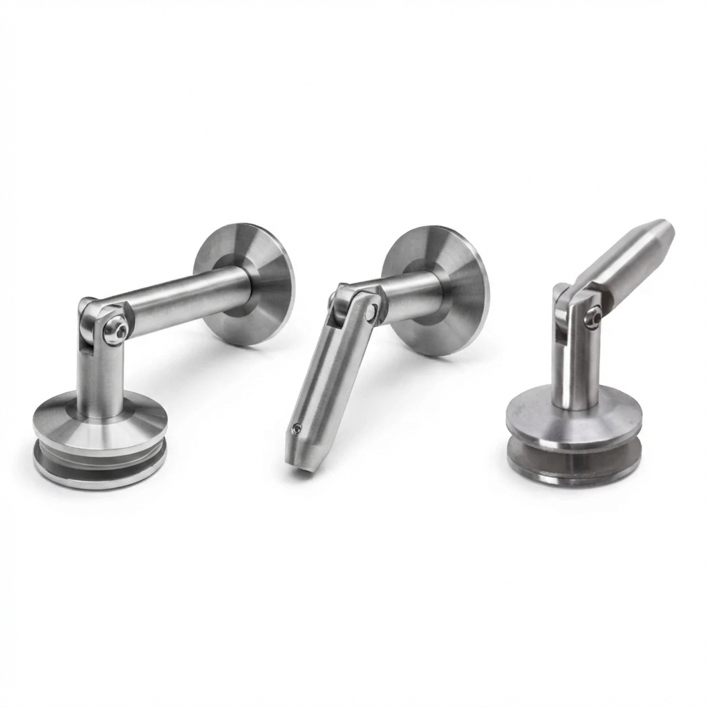 Systém se skládá ze tří přesně vyrobených spojek z nerezové oceli AISI 304 v saténovém provedení, které zajišťují dlouhodobou odolnost a estetický vzhled. Každý prvek má skrytý montážní otvor, díky čemuž celá konstrukce působí elegantně a minimalisticky. Sklo nepřichází do přímého kontaktu s kovem – součástí sady jsou přítlačné gumové podložky, které chrání tabuli a zároveň ji stabilizují ve správné poloze.