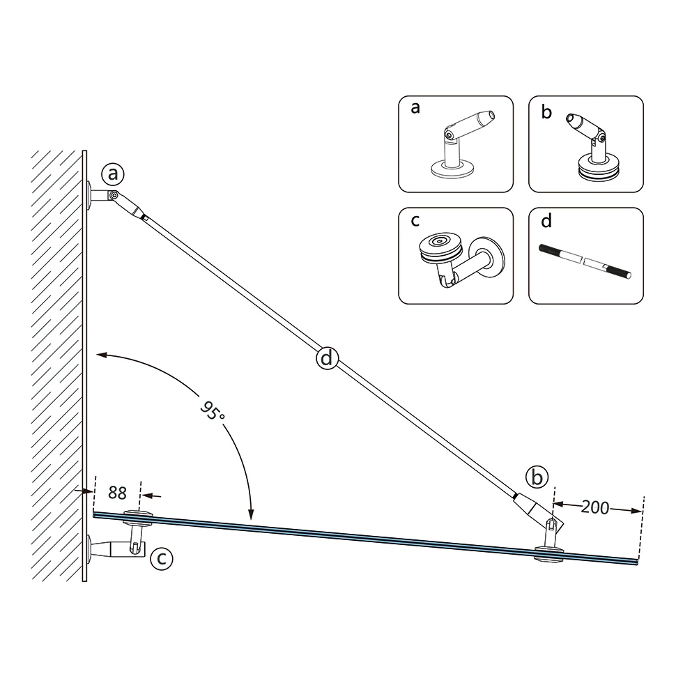 Táhlo je kotveno do fasády budovy pomocí spojky táhlo–stěna (prvek a) a následně napínáno do optimální polohy stříšky. Spojka stěna–sklo (prvek c) udržuje spodní hranu tabule ve vzdálenosti 88 mm od fasády, zatímco spojka sklo–táhlo (prvek b) přenáší zatížení na táhlovou tyč. Rozsah nastavení úhlu táhla je až 95°, což umožňuje přizpůsobení systému různým montážním podmínkám.