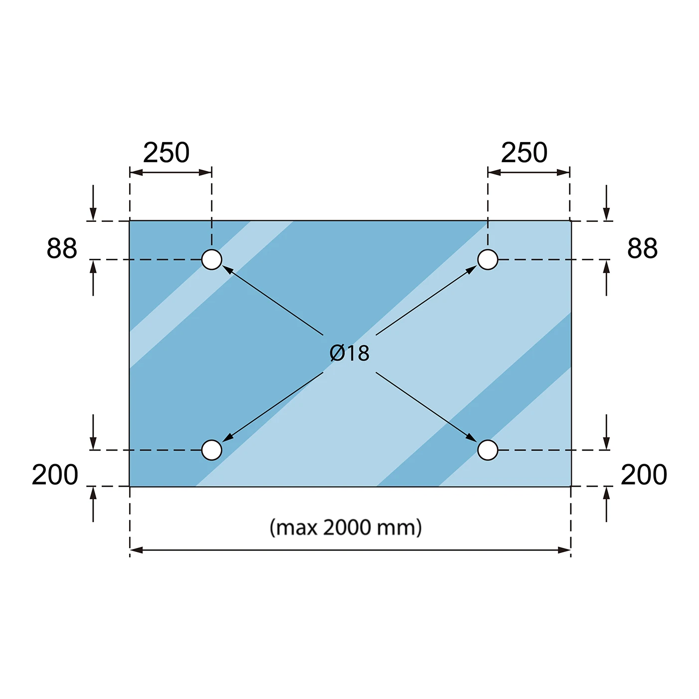 - Horní otvory (spojky stěna–sklo): 88 mm od horní hrany, 250 mm od bočních hran