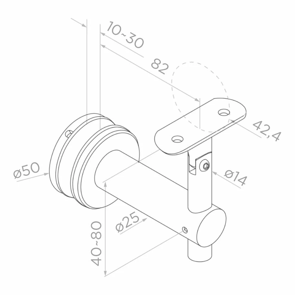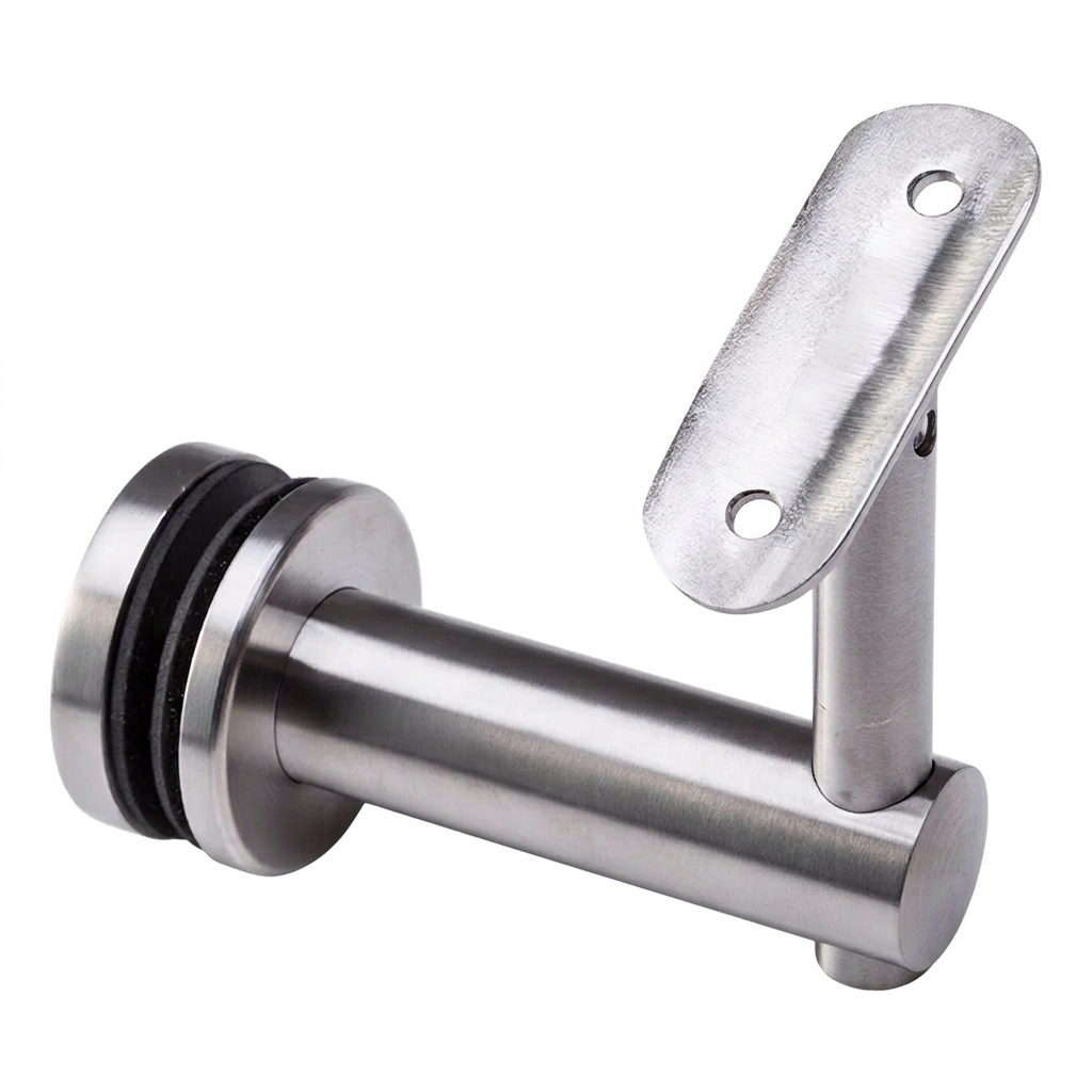 Kloubový držák madla ke sklu s bodovým uchycením — spolehlivý prvek skleněných zábradlí v systému trubky Ø 42,4 mm. Díky kloubové konstrukci umožňuje plynulé nastavení úhlu naklonění sedla, což dovoluje přizpůsobit madlo k schodům, rampám a balkonům bez nutnosti použití dodatečných adaptérů. Vyroben z nerezové oceli AISI 304 v saténovém provedení — odolný proti korozi a snadno udržovatelný, vhodný jak pro vnitřní, tak i venkovní montáž.
