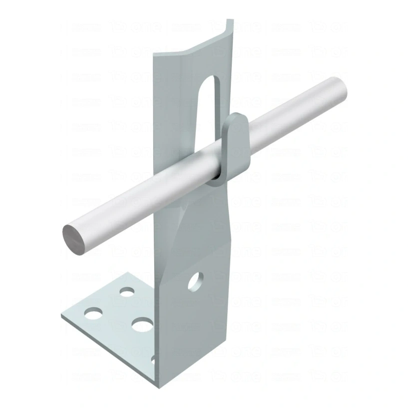 Držák je univerzální — lze jej montovat jak na zděné a dřevěné podklady, tak i na střechy kryté plechem, šindelem či lepenkou. K upevnění postačují šrouby, rozpínací hmoždinky nebo nýty, což umožňuje rychlé přizpůsobení podmínkám na stavbě.
