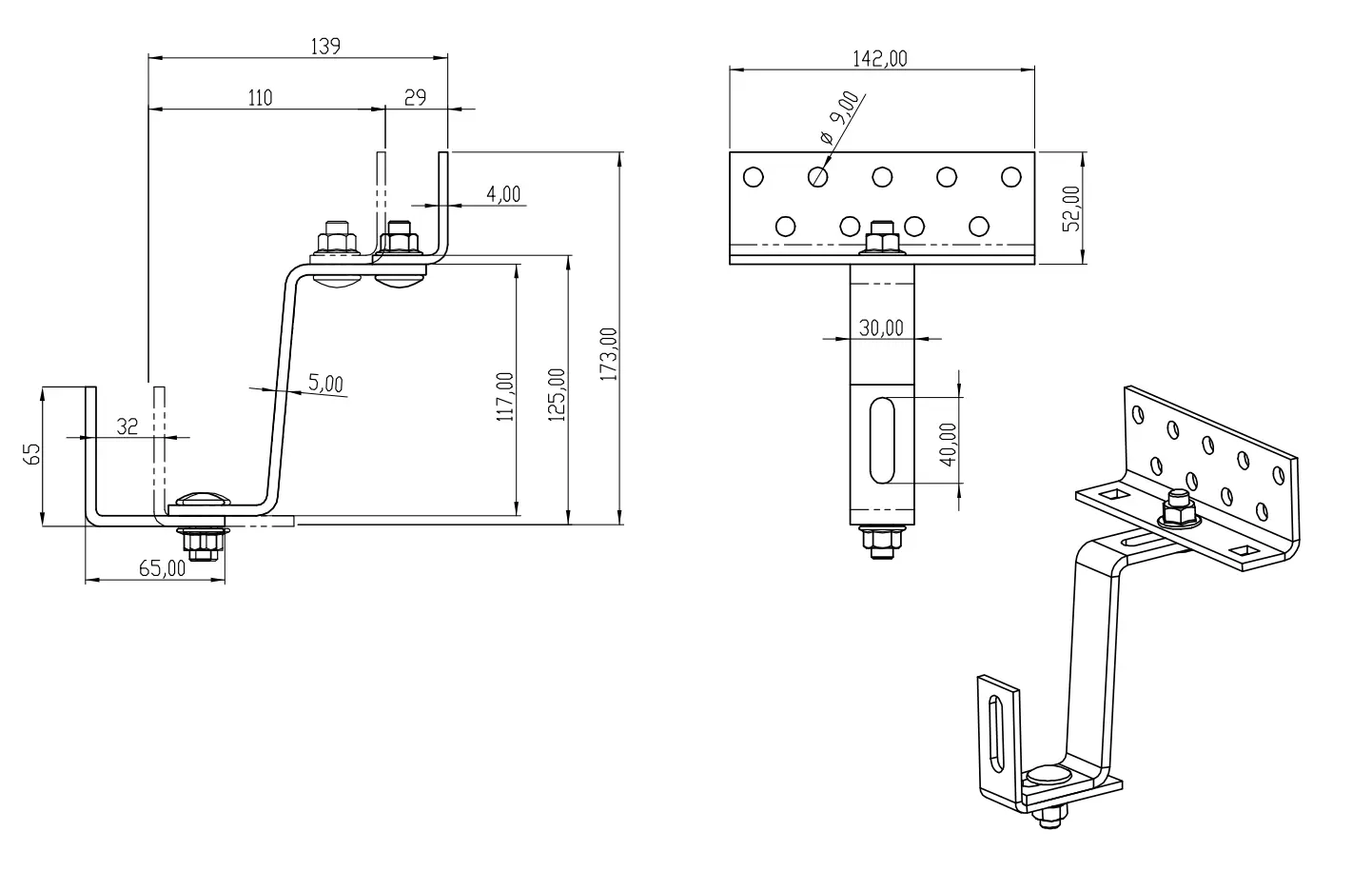 Střešní hák Vario 3X nastavitelný, nerezová ocel A2 1.4301, o rozměrech 120x30x5/4mm s otvorem M10 pod profil pro fotovoltaické systémy.