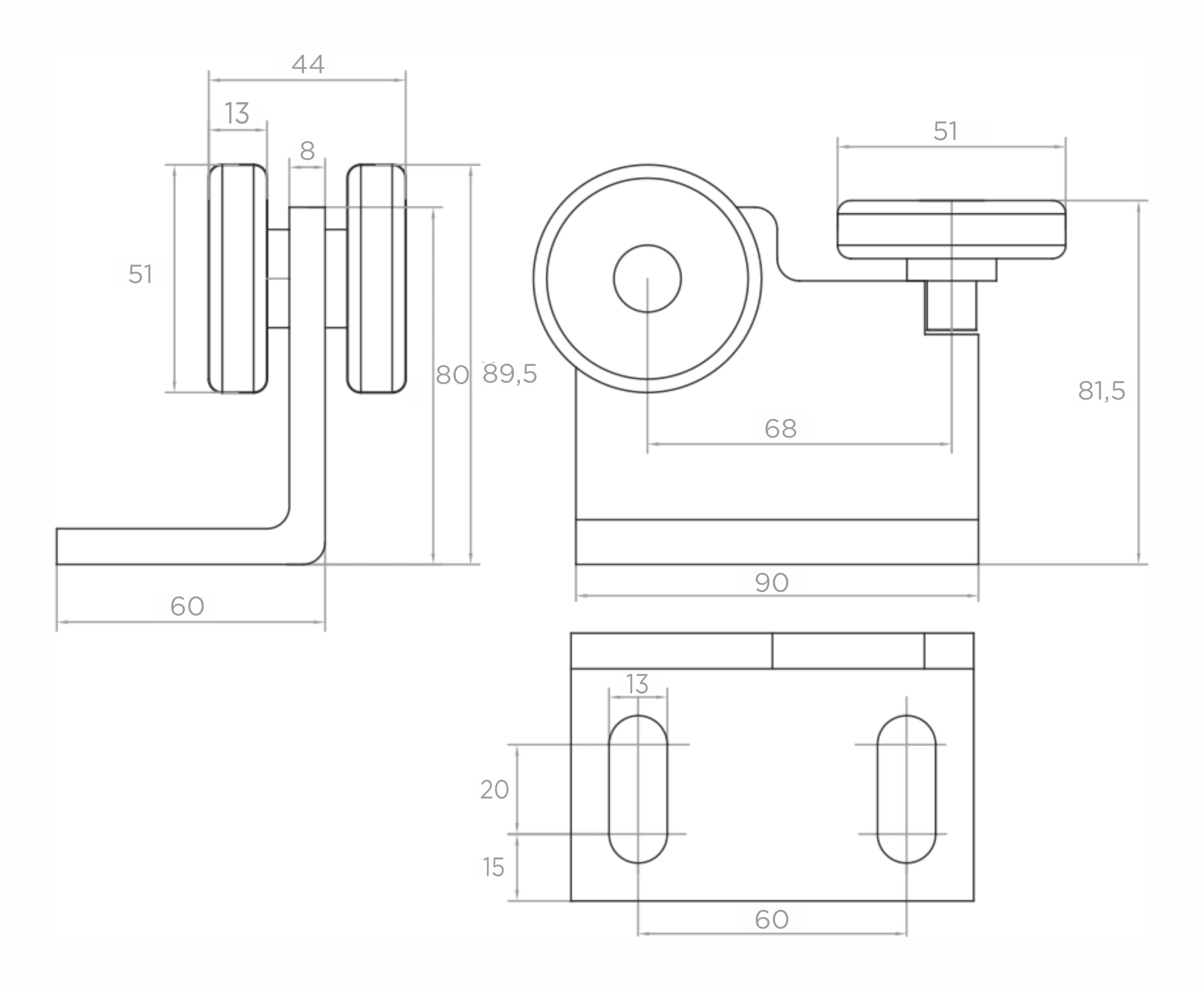 Vozík je připraven k okamžité montáži – připevňuje se šrouby přes drážkové otvory v základně přímo ke konstrukci křídla brány. Podlouhlý tvar otvorů umožňuje nastavení polohy v rozsahu několika milimetrů, což je klíčové při vyrovnávání brány po instalaci.