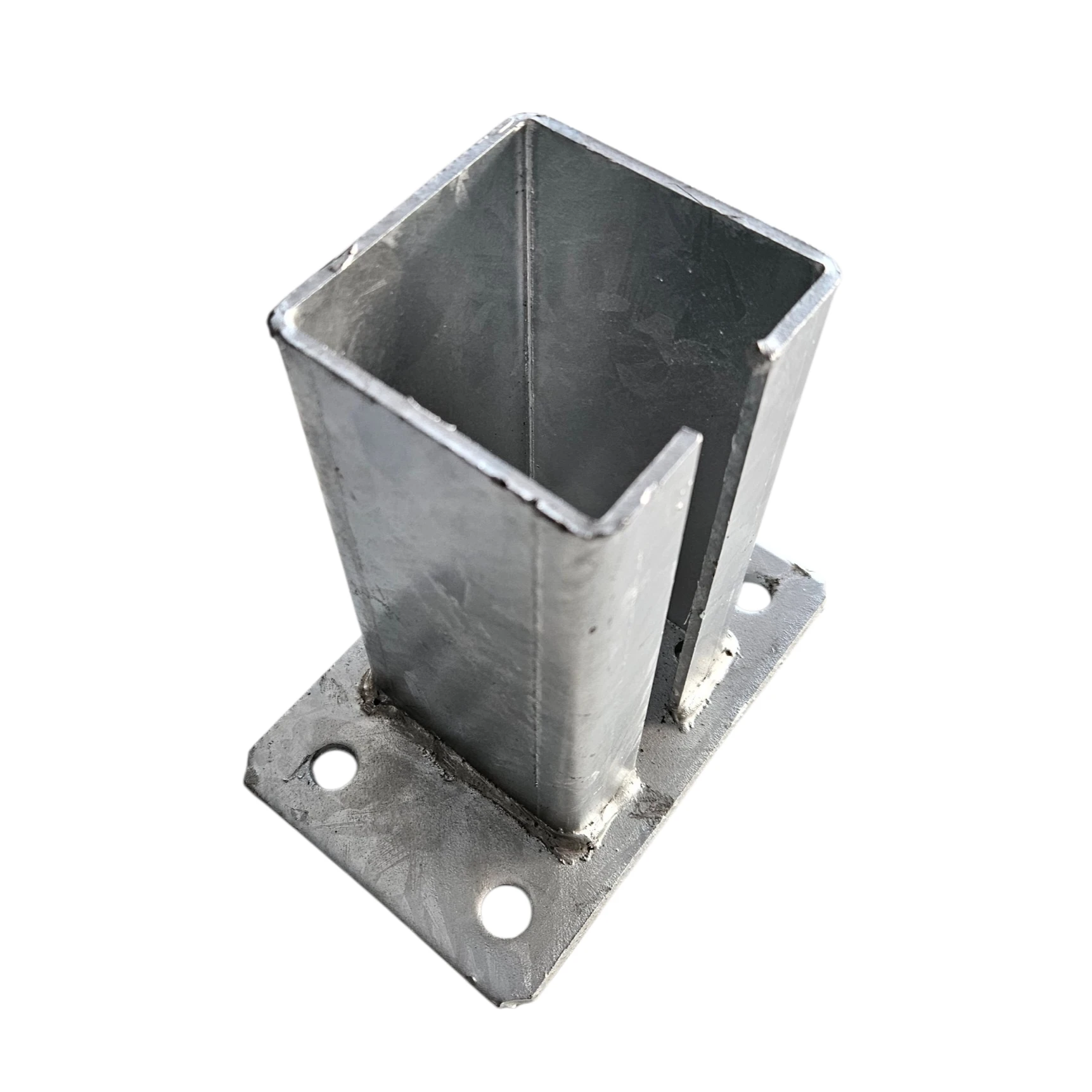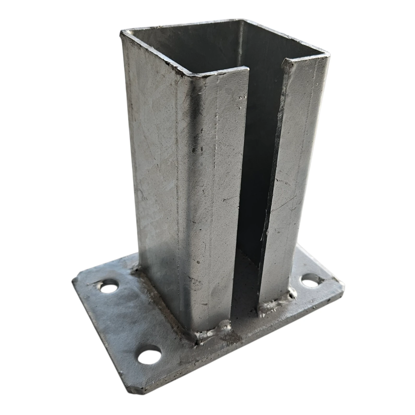 Konstrukce se skládá z otevřeného čtvercového profilu 73×73 mm (přizpůsobeného sloupku 80×80 mm) přivařeného k masivní montážní desce se čtyřmi otvory pro kotvící šrouby. Koutový svar u základny profilu zaručuje solidní přenos zatížení. Svislá štěrbina v profilu umožňuje přesné přizpůsobení a kompenzaci tolerancí sloupku.