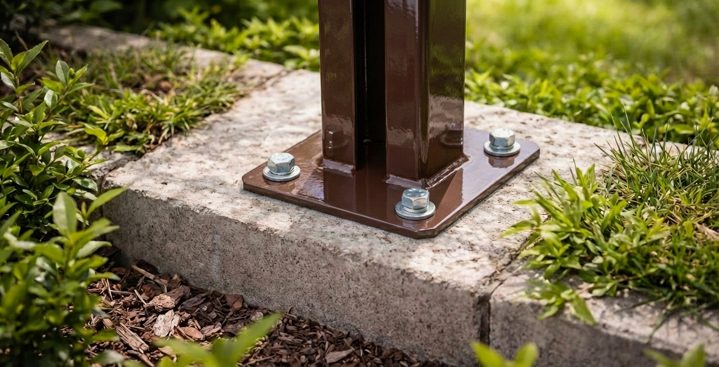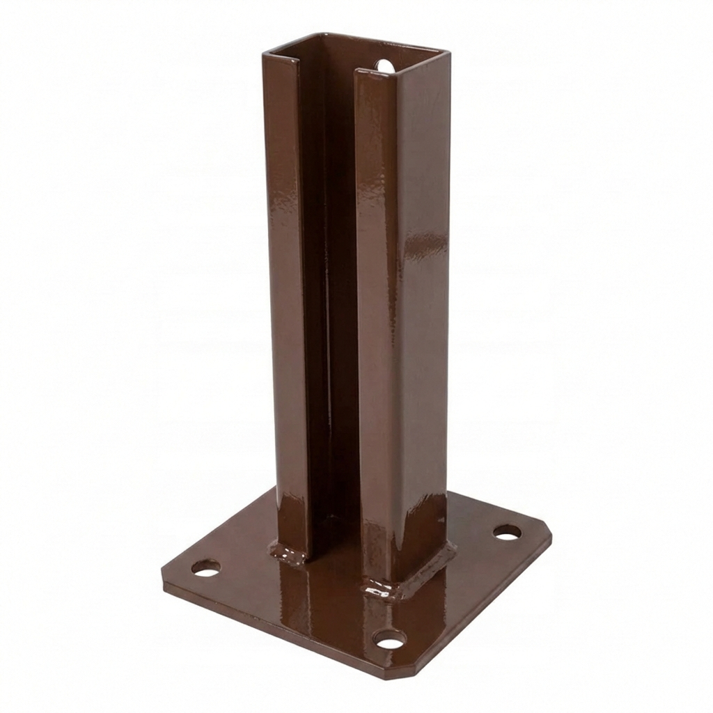 Patka plotového sloupku 60×40 mm je odolná ocelová konzole určená k montáži panelových sloupků na betonový podklad. Díky galvanickému pozinkování a práškovému lakování v hnědé barvě (RAL 8017) poskytuje výrobek účinnou protikorozní ochranu a estetický vzhled — ideální pro venkovní aplikace.