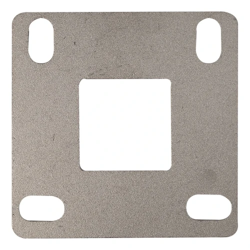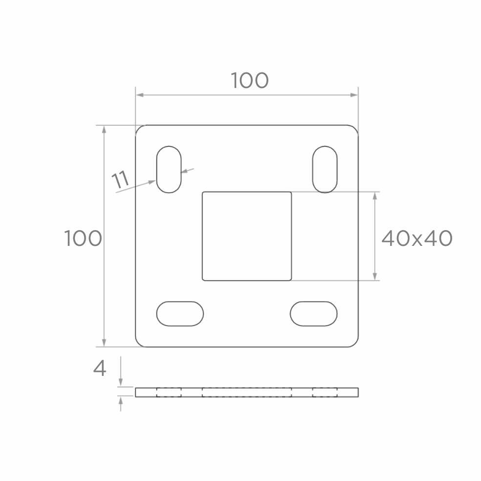 Základna má střední čtvercový otvor 40x40 mm přizpůsobený profilu sloupku a čtyři montážní otvory podlouhlého typu (11x20 mm), které umožňují přesnou regulaci pozice při přišroubování k podkladu. Surový povrch (bez dodatečné úpravy) umožňuje svařování bez nutnosti odstraňování povlaků — připravená k práci ihned po vyndání z obalu.