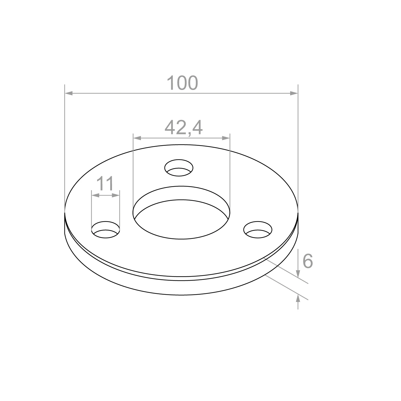 Základna má tři montážní otvory o průměru 11 mm rozmístěné rovnoměrně na obvodu, což umožňuje spolehlivé a symetrické uchycení. Centrální otvor o průměru 42,4 mm je přizpůsoben sloupkovým trubkám systému 42,4 mm — sloupek se svařuje přímo do otvoru, čímž se získá trvalé a tuhé spojení.